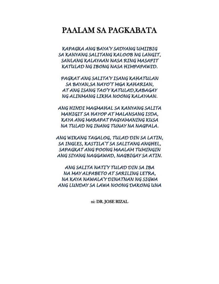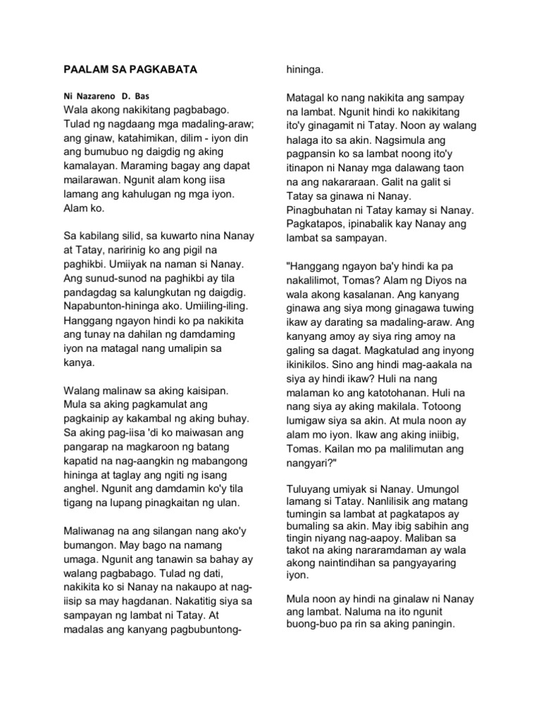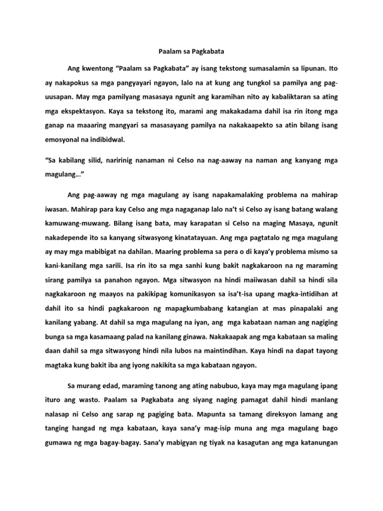 Paalam Sa Pagkabata from imgv2-2-f.scribdassets.com Ang laki sa layaw, karaniwa'y hubad, sa bait at muni't sa hatol ay salat. ( sumusunod sa uso/ pagtalima sa batas/ may dati ng resolusyon/ may ipinatutupad na batas) 2. Maraming bagay ang dapat mailarawan. Maraming bagay ang dapat mailarawan. Contextual translation of paalam sa pagkabata into english. Bas panamilit sa kabantanon ni santiago pepito wala akong nakikitang pagbabago. Paalam sa pagkabata menchu lacsamana. Isulat ito sa isang buong papel.
