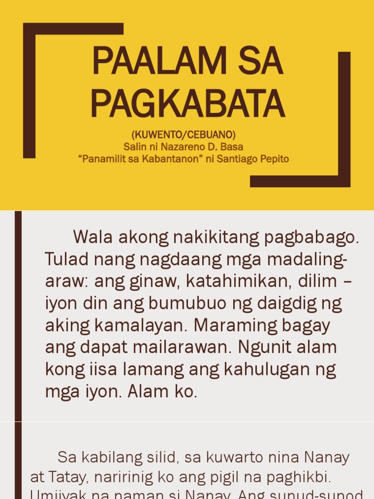 Ngunit alam kong iisa lamang ang kahulugan ng mga iyon. Maraming bagay ang dapat mailarawan. Tuig 0069 miliminas, ito ang pangkat ng mga pulo na matatagpuan sa kalagitanaan ng dagat pasipiko bago pa nagkaroon ng malaking pagbaha. Mula sa panamilit sa kabantann ni zantiago pepito. Paalam sa pagkabata (kuwento/cebuano) salin ni nazareno d. Inilalarawan ni celso ang takbo ng kanyang buhay. Ang laki sa layaw, karaniwa'y hubad, sa bait at muni't sa hatol ay salat. Bas narito ang buod ng kwentong paalam sa pagkabata. Santiago pepito paalam sa pagkabata ay kwentong cebuano na isinalin sa filipino ni nazareno d. Taong 0069 ni nilo par pamonag salin ni ruby v. Paalam sa pagkabata huwebes, hulyo 11, 2013. Maraming bagay ang dapat mailarawan. Magkulang ka na sa magulang, huwang lamang sa biyenan.